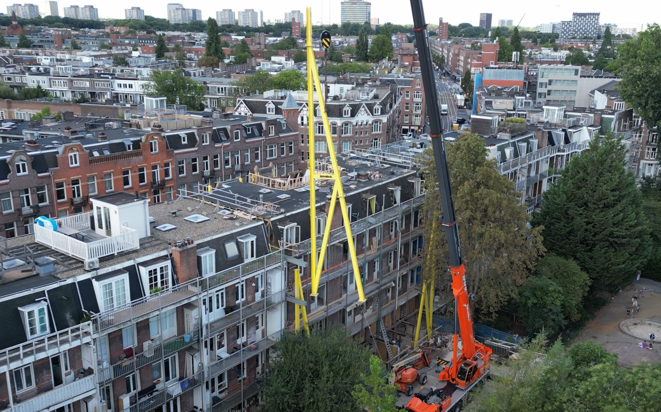 Op de Admiraal de Ruijterweg 70-74 hebben we vijf zware schoren op hun plaats gehesen. Elke schoor weegt 5 ton, is 4,5 meter breed en maar liefst 17,5 meter hoog. De schoren zijn gemonteerd op de eerder aangebrachte ankers en vormen samen met de zijliggers de noodzakelijke constructie om de voorgevel te behouden tijdens de sloop van het complex (drie panden).