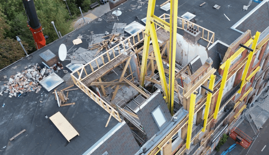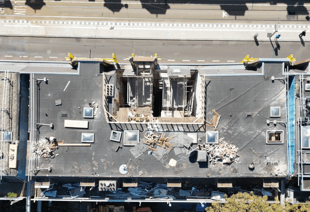 Zie onder het beeld van bovenaf op de panden met het gat dat is gemaakt in het dak om de drie schoren te laten zakken. Op deze foto is goed te zien dat de panden links en rechts al handmatig los van elkaar zijn gesloopt (600 mm geheel vrij van voor naar achteren maar ook van beneden naar boven).