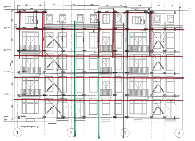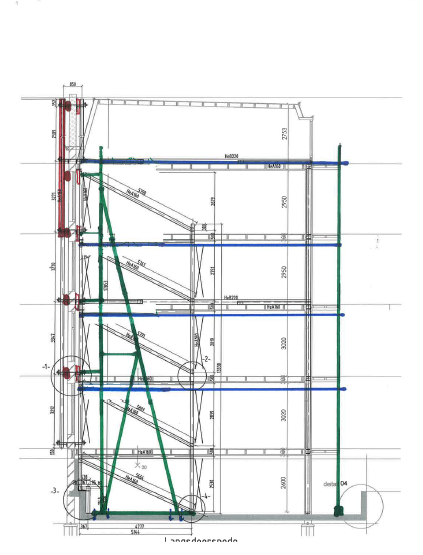In onderstaande tekeningen kunt u zien hoe het stalen korset (rood) en de schoren (groen) worden toegepast.