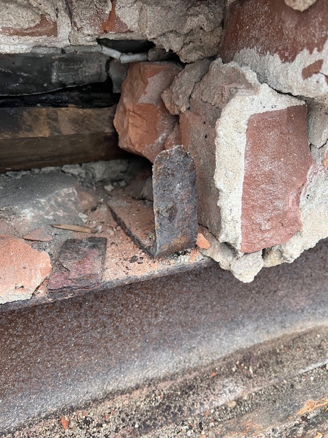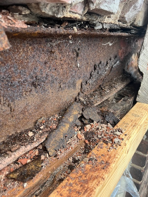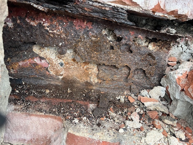 Op onderstaande foto’s is duidelijk te zien hoever de stalen balk in de gevel is aangetast waarbij een groot deel van het lijf is verdwenen.