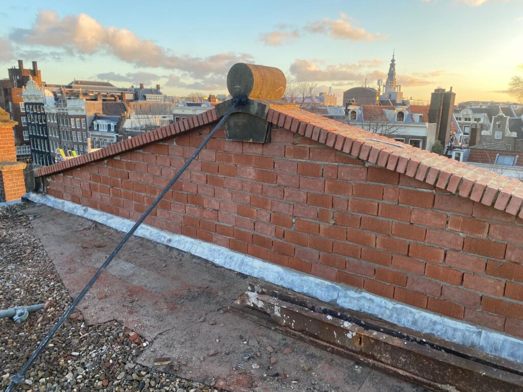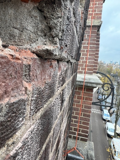 Met een drone inspectie zagen we dat het staal boven de kozijnen op de 4e verdieping zo sterk aan het corroderen was dat de lintvoeg op twee locaties geheel open stond. Toen we de steiger hadden opgezet was de schade snel duidelijk. Met een ouderwets schietlood op de topgevel werd duidelijk dat de gehele topgevel 60 mm naar buiten werd gedrukt en naar voren helde. Nu is dit in Amsterdam veel het geval bij grachtenpanden (op de vlucht noemde men dit), maar dit had een andere oorzaak. De gevel werd door het staal naar buiten gedrukt.