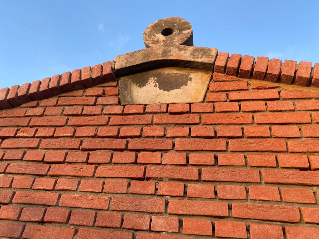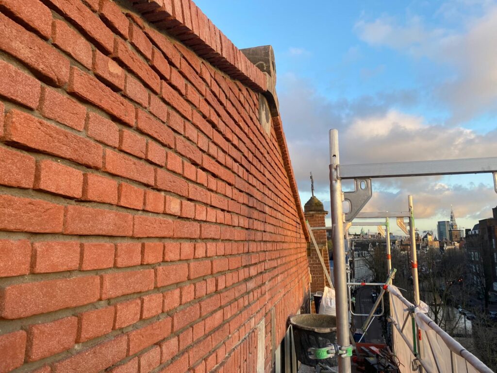 Voor de kerstreces hebben wij de stalen balk verwisseld voor een gegalvaniseerde stalen balk en ingebracht in de gevel. Ook hebben we de topgevel opnieuw opgemetseld en zijn de natuursteen segmenten op de top teruggebracht. Onderstaande foto’s na het terugbrengen van de gevel in oude staat: