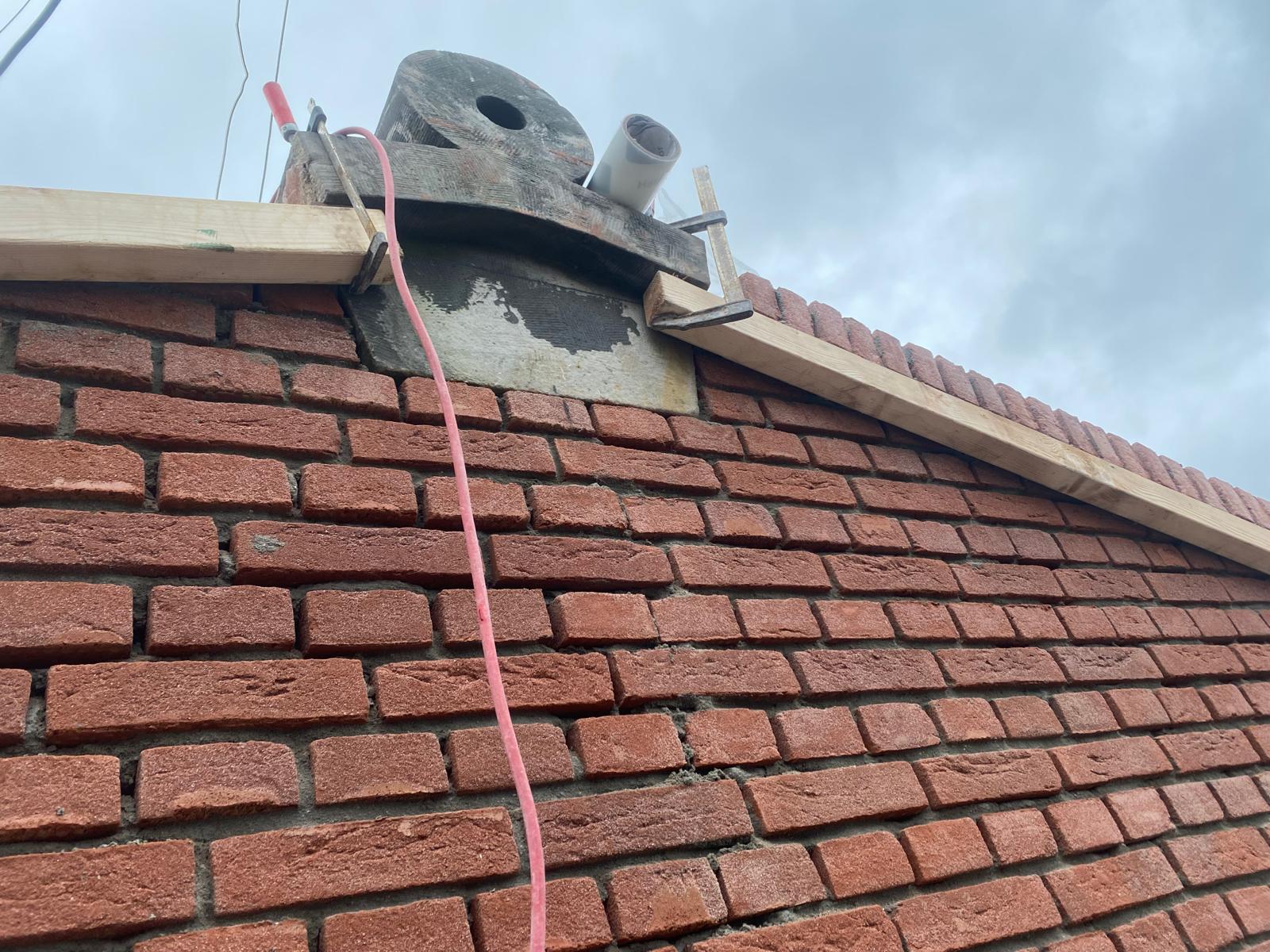 Samen met het bestuur van de VVE is besloten dat we de topgevel in zijn geheel demonteren omdat het te gevaarlijk is om alleen de stalen balk te vervangen. Indien de topgevel opnieuw wordt opgemetseld kan deze ook weer recht met de voorgevel opgemetseld worden en is het gevaar van overhellen en vallen geweken.