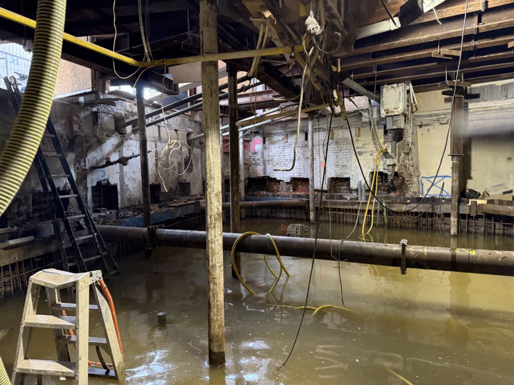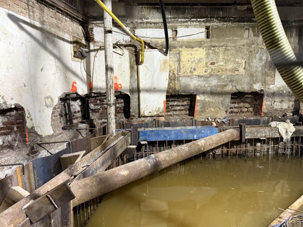 - Maandag 18 augustus: Hervatten van het funderingsherstel door het verwijderen van de stalen ringbalk en de schoren. Daarna vlechten we de wapening, plaatsen we de bekisting en storten we de nieuwe betonwanden.