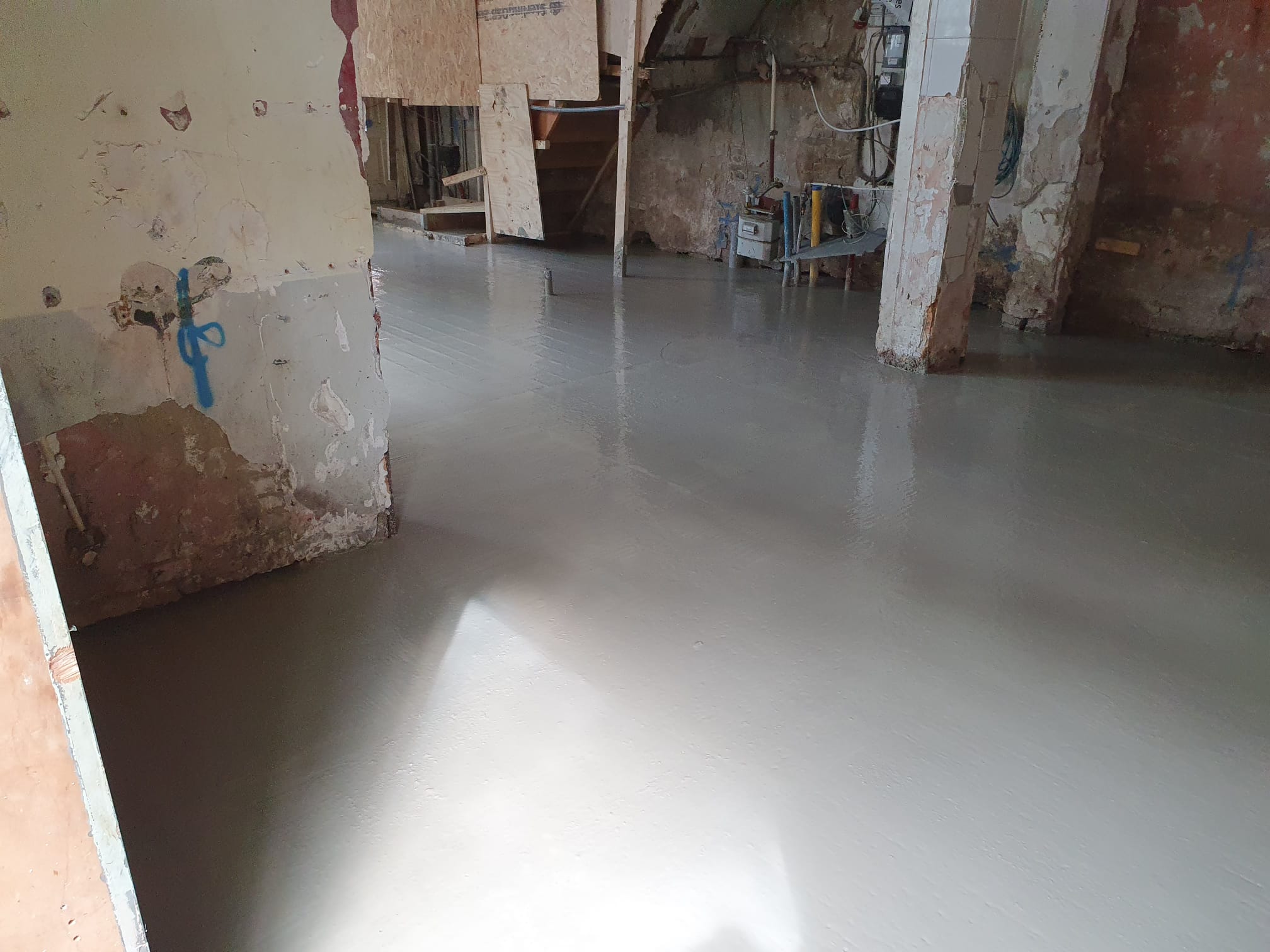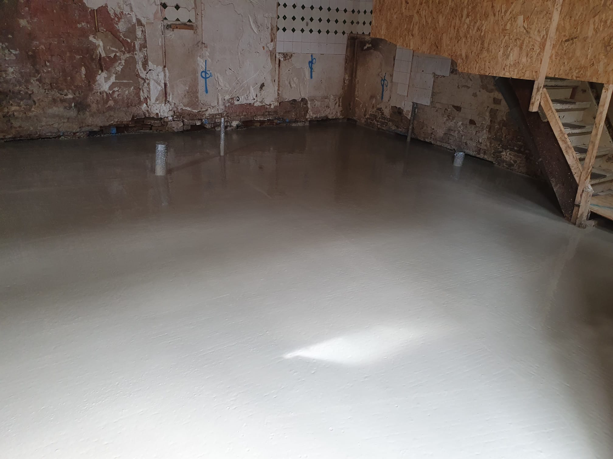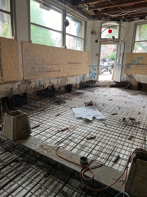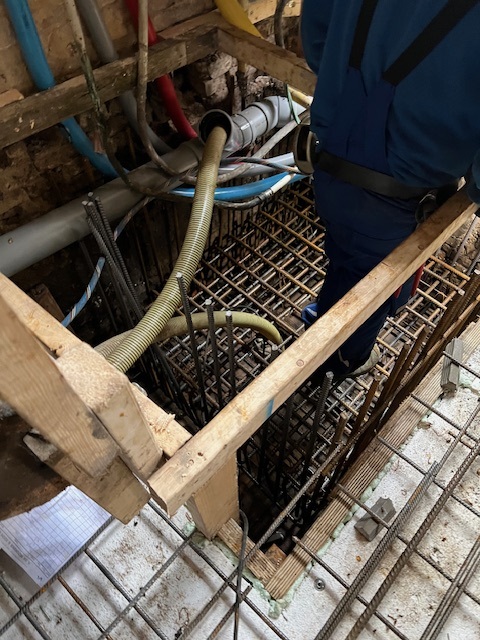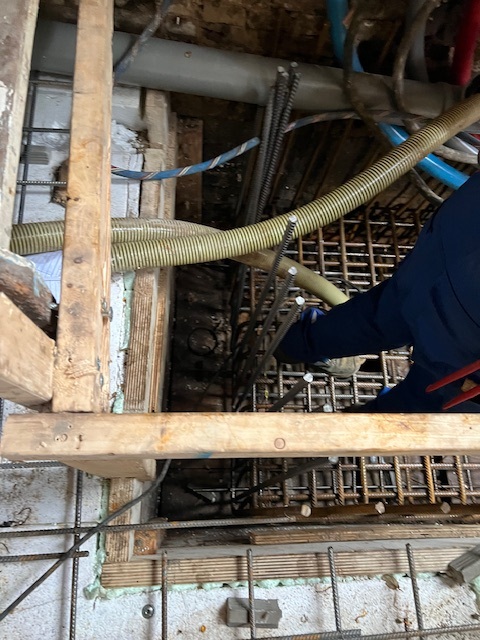 We vorderen gestaag met de renovatie van het pand Dusartstraat/Rustenburgerstraat. In alle vroegte hebben we de constructieve betonvloer aangebracht. Deze moet eerst goed uitharden en als we daarna de kassen (sparingen) hebben verankerd, dan staat het gebouw weer stabiel op zijn nieuwe fundering/palen.