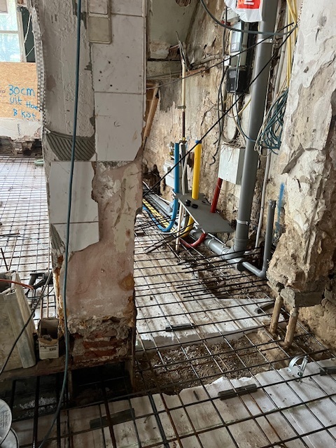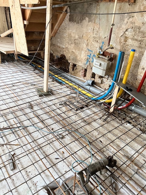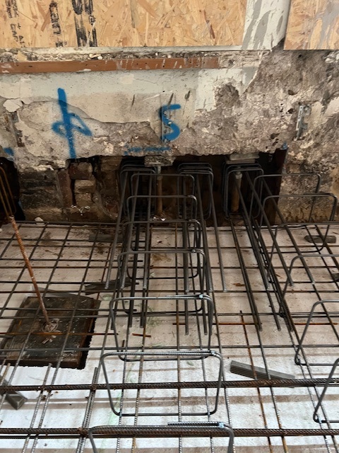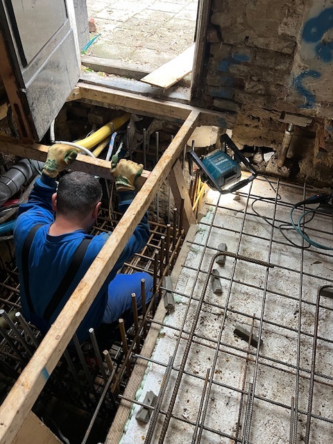 Nadat de nieuwe fundering gereed is gaan we direct door met de inbouw van de bedrijfsruimte; scheidingswanden van de trappenhuizen en bedrijfsruimte. Bovendien komt volgende week de steiger voor de gevels en kunnen we met het metselwerk herstel starten.